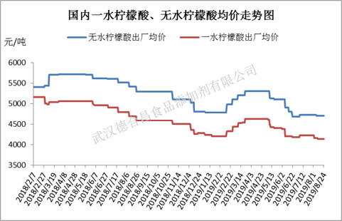 據網絡數據監測,截止8月24號,國內一水檸檬酸出廠均價在4140元/噸,無水檸檬酸出廠均價4700元/噸,市場成交實單實談,商談空間大。國內一水檸檬酸均價環比上月同期跌幅在1.90%,同比去年同期跌幅11.73%,無水檸檬酸均價環比上月跌幅0.42%,同比去年同期跌幅13.12%。